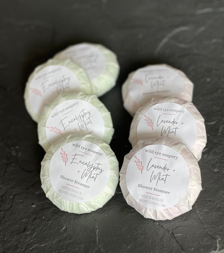Introducing Wild Rye Shower Steamers - an aromatherapy spa experience for your shower. Put a few drops of water on one to activate, set it outside of the heavy spray of water and let the menthol and essential oils soothe your senses. Current scents include Lavender + Mint, Citrus + Mint and Eucalyptus + Mint, created to relax or energize depending on your mood.