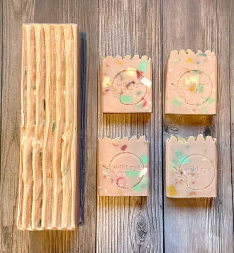 Ingredients: Saponified oils (olive oil, coconut oil, shea butter, rice bran oil, avocado butter and castor oil) raw goat milk, soap pieces, sodium lactate, responsibly-sourced mica and phthalate-free fragrance oil.